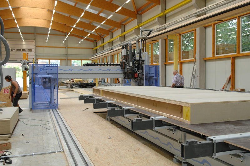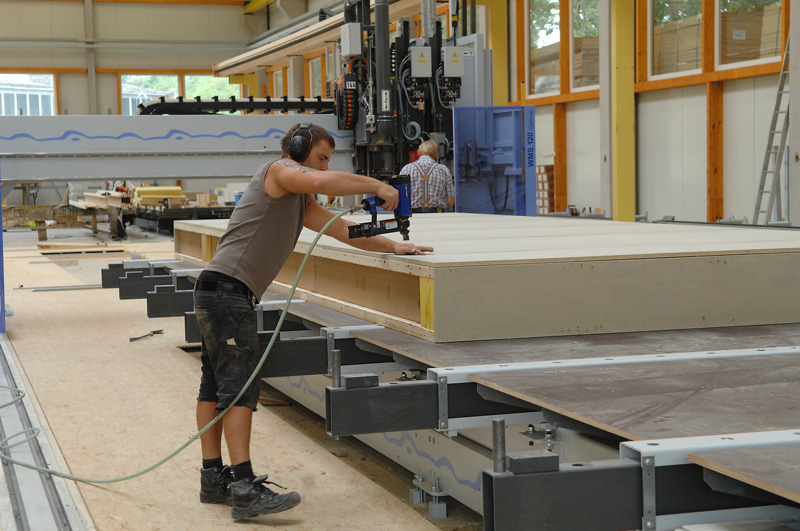 Großflächige Bauelemente werden unter Idealbedingungen in unserer Werkhalle vorgefertigt. Nach 1 bis 2 Tagen steht die wetterfeste Gebäudehülle. Der Ausbau kann sofort darauf beginnen. Trockenzeiten, wie man sie vom Nassbau kennt, entfallen.