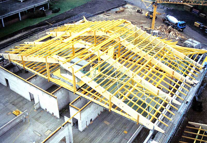 Auch Großprojekte, wie hier der Neubau einer Großküche für den Landesverein für Innere Mission in Rickling werden von uns ausgeführt. Die Besonderheit bei diesem Bauvorhaben war neben der Größe auch die von uns auf der Baustelle vormontierten Dachsegmente. Jedes dieser vormonierten Dachsegmente brachte ein Gewicht von ca 90 Tonnen auf die Waage. Ein Dachsegment bestand aus zwei Brettschichtholzgebinden sowie der Koppelpfetten und Balkenlage im Untergurtbereich. Die Ausführung erfolgte im Jahr 2004.