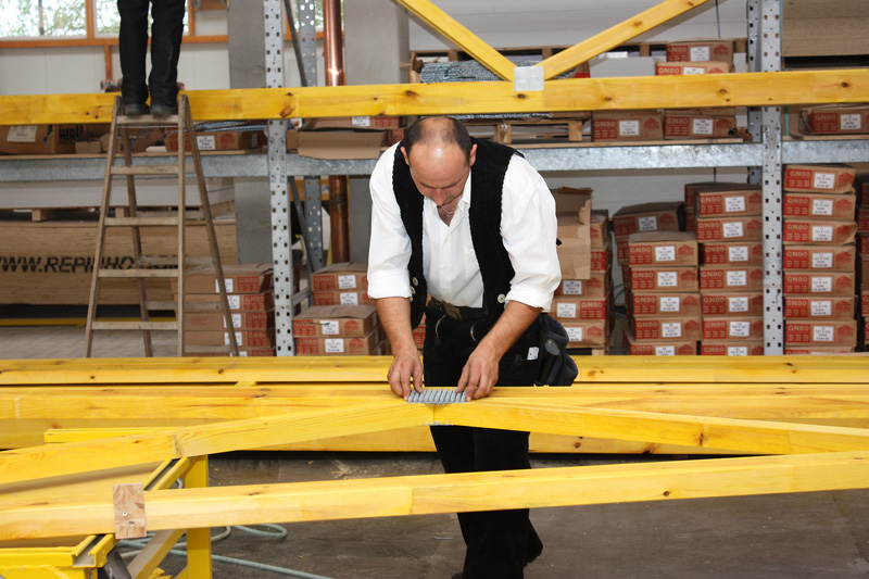 Zu Beginn des Fertigungsprozesses schneiden unsere vollautomatischen CNC-gesteuerten Sägen innerhalb kürzester Zeit die Holzteile entsprechend der CNC-Daten zu. Anschließend pressen unsere Facharbeiter die Nagelplatten aus feuerverzinktem oder nicht rostendem Stahl beidseitig an den Knotenpunkten in das bearbeitete Holz.