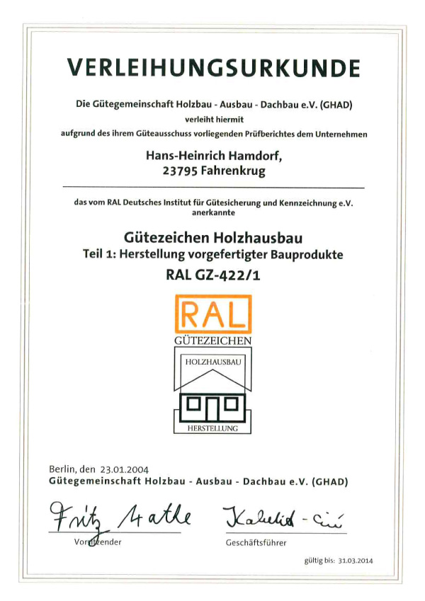 Darüber hinaus sind wir Träger des RAL Gütezeichens Holzhausbau. Diese Auszeichnung stellt die höchste Qualifizierung im Holztafelbau dar. Aktuell sind nur cirka 500 Unternehmen in ganz Deutschland Träger dieser Auszeichnung.