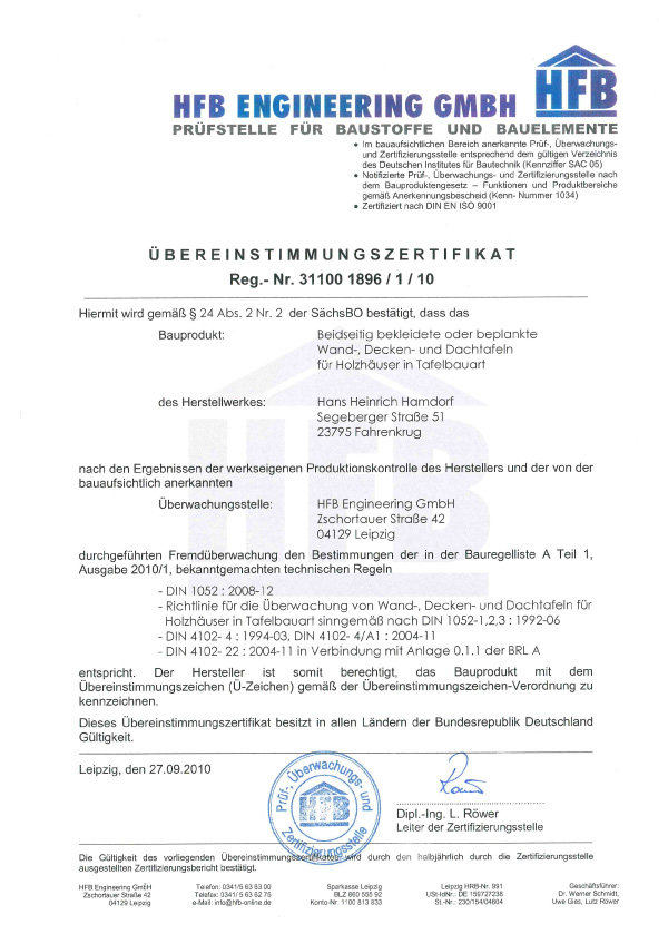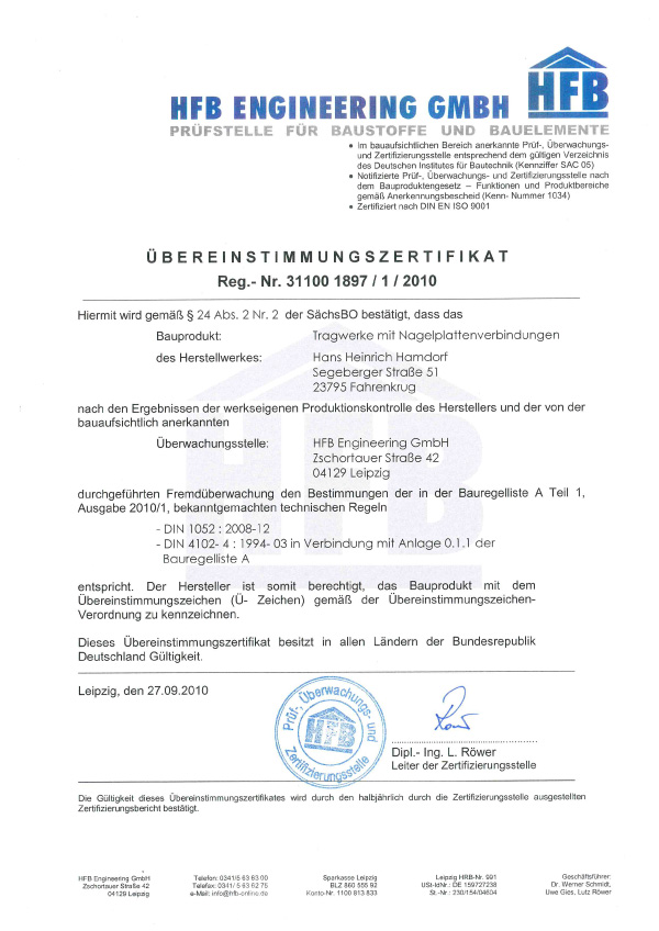 Unsere Produktion zur Herstellung von beidseitig beplankten Dach-, Wand- und Deckenelementen sowie die Herstellung der Nagelplattenbinder wird von der HFB Engineering GmbH Güte und Fremdüberwacht.