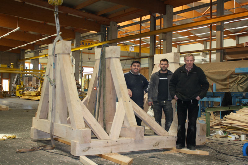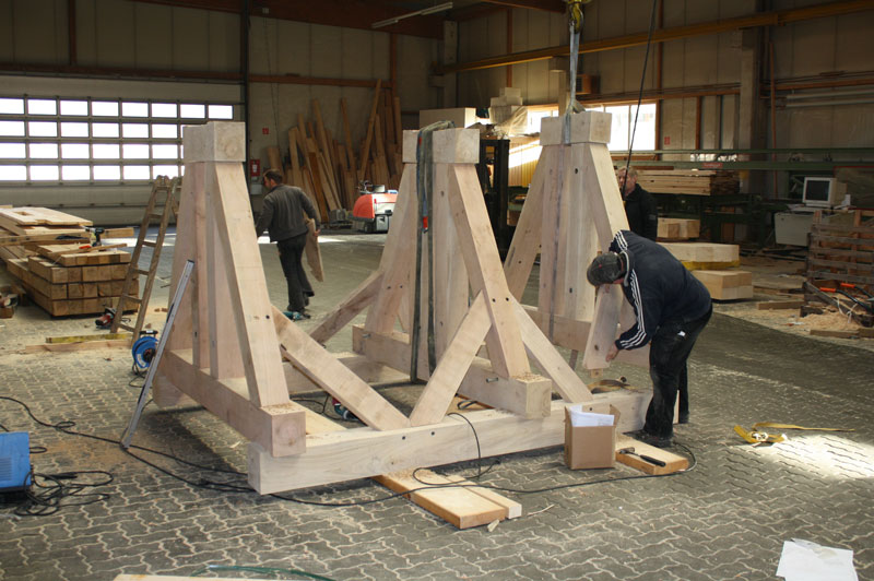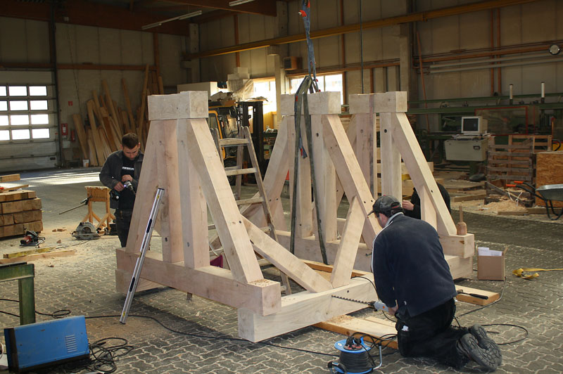 Uralte traditionelle Holzverbindungen werden von uns zum Beispiel im Fachwerkbau umgesetzt und passgenau auf unseren Abbundanlagen zugeschnitten. Hier am Beispiel eines Glockenstuhles welcher vor der Endmontage durch uns in der Werkhalle vorher gefügt wurde.
