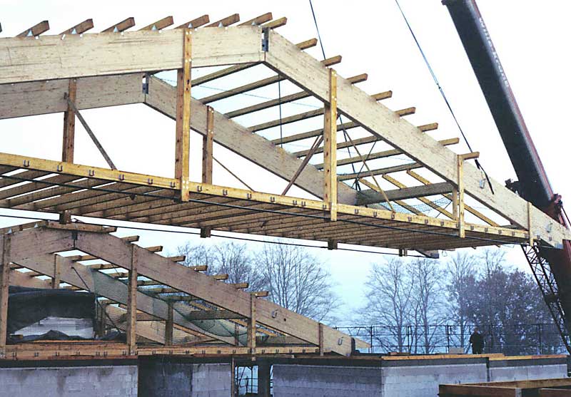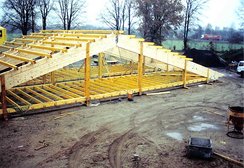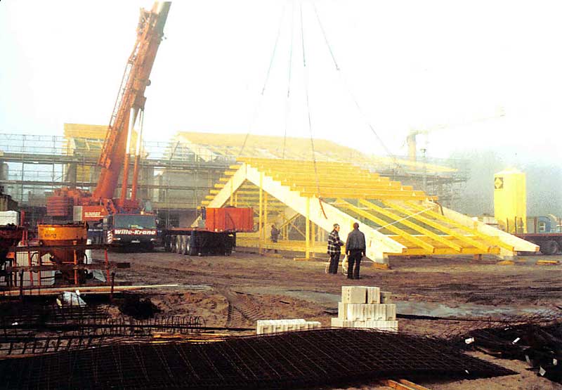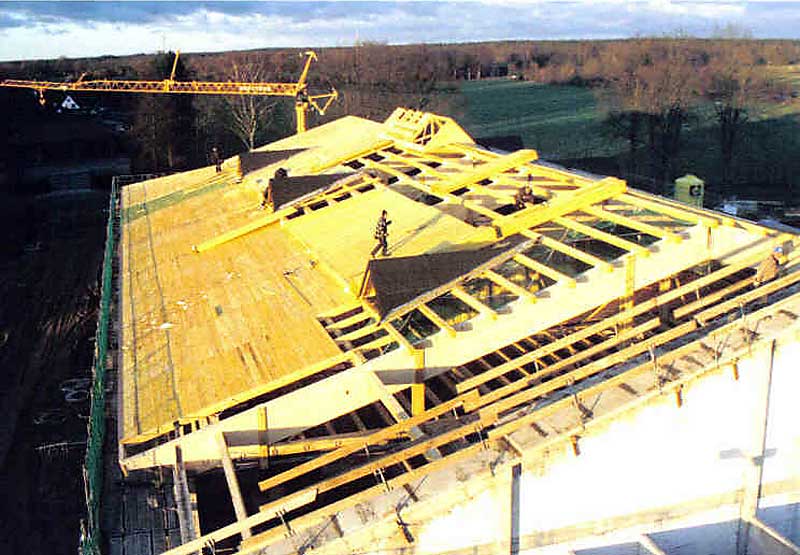 Auch Großprojekte, wie hier der Neubau einer Großküche für den Landesverein für Innere Mission in Rickling werden von uns ausgeführt. Die Besonderheit bei diesem Bauvorhaben war neben der Größe auch die von uns auf der Baustelle vormontierten Dachsegmente. Jedes dieser vormonierten Dachsegmente brachte ein Gewicht von ca 90 Tonnen auf die Waage. Ein Dachsegment bestand aus zwei Brettschichtholzgebinden sowie der Koppelpfetten und Balkenlage im Untergurtbereich. Die Ausführung erfolgte im Jahr 2004.