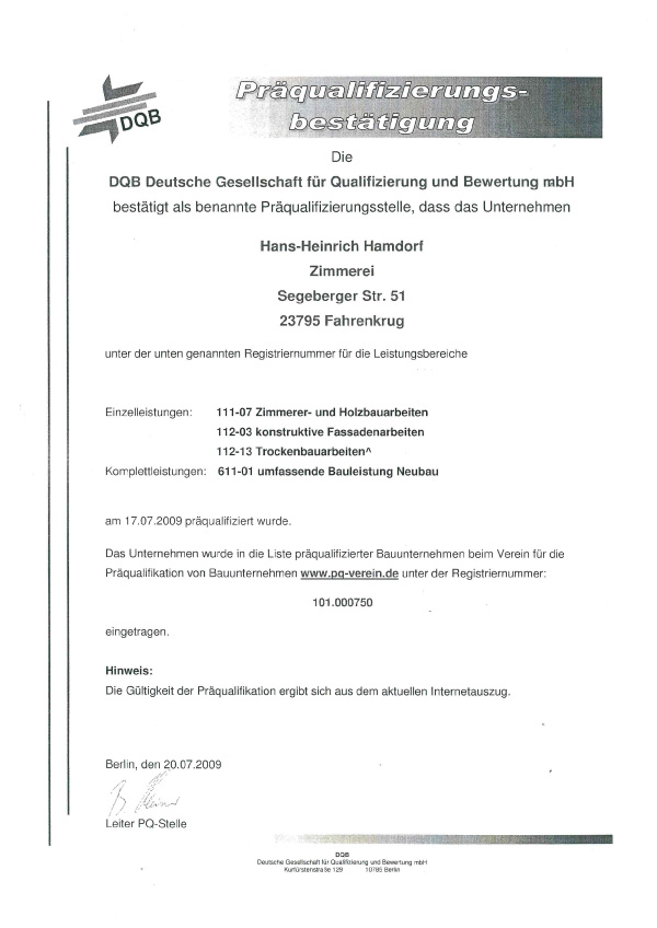 Die handwerkliche Qualität unserer hergestellten Produkte und handwerklichen Leistungen hat für uns oberste Priorität. Wir sind deshalb als eines der ersten Unternehmen von der DQB Deutsche Gesellschaft für Qualifizierung und Bewertung mbH präqualifiziert worden. Unsere PQ Nummer lautet 101.000750