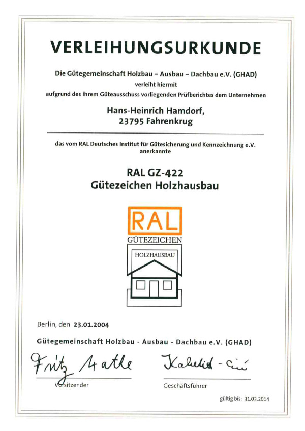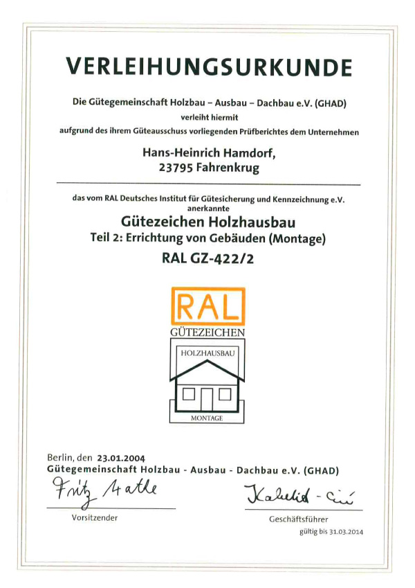 Darüber hinaus sind wir Träger des RAL Gütezeichens Holzhausbau. Diese Auszeichnung stellt die höchste Qualifizierung im Holztafelbau dar. Aktuell sind nur cirka 500 Unternehmen in ganz Deutschland Träger dieser Auszeichnung.